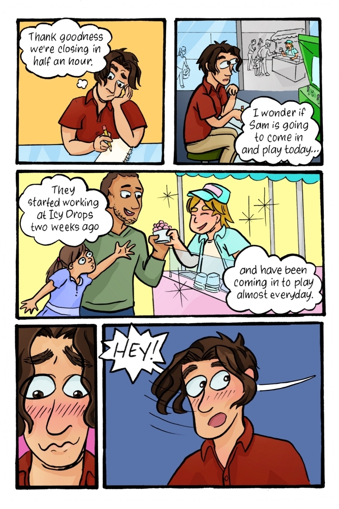Magical Boys is a slice-of-life style comic that follows Caroline, a closeted trans teen obsessed with drawing bishounen, who bonds with kindred spirit, Sam. As the story begins, Caroline is drawing a pretty vampire boy in their sketchbook at work while waiting for closing time and "nonchalantly" checking out the cute new gender-ambiguous employee Sam, who just started working at the ice cream stand next door...